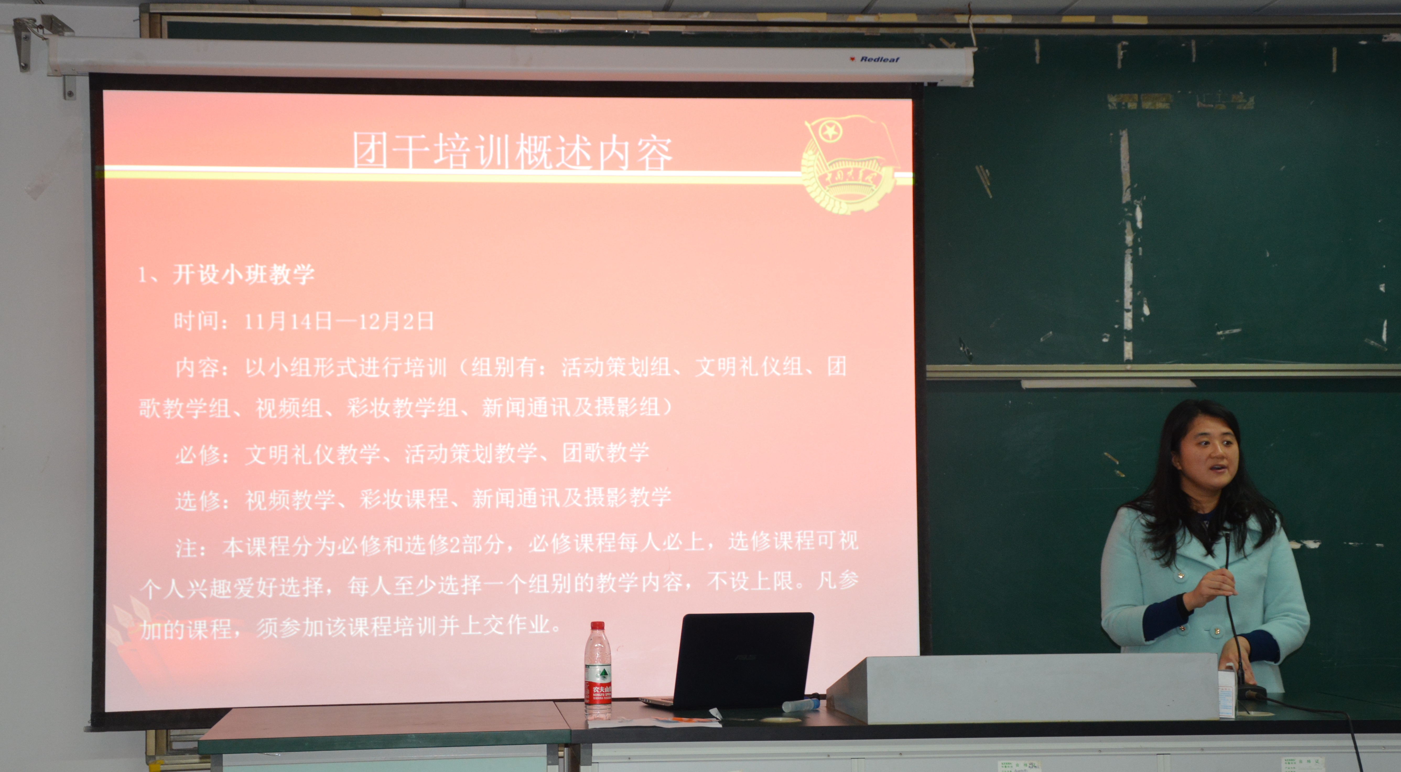2015年11月11日下午,色花堂 第十一届团干培训班开班典礼在5号实验楼226教室成功举办。出席本次开班典礼的有院学工办主任程心皓老师,团委书记陈好老师,团委副书记吕京京老师以及院团学联主席团。此次典礼由团委组织部干事黄依琳主持。