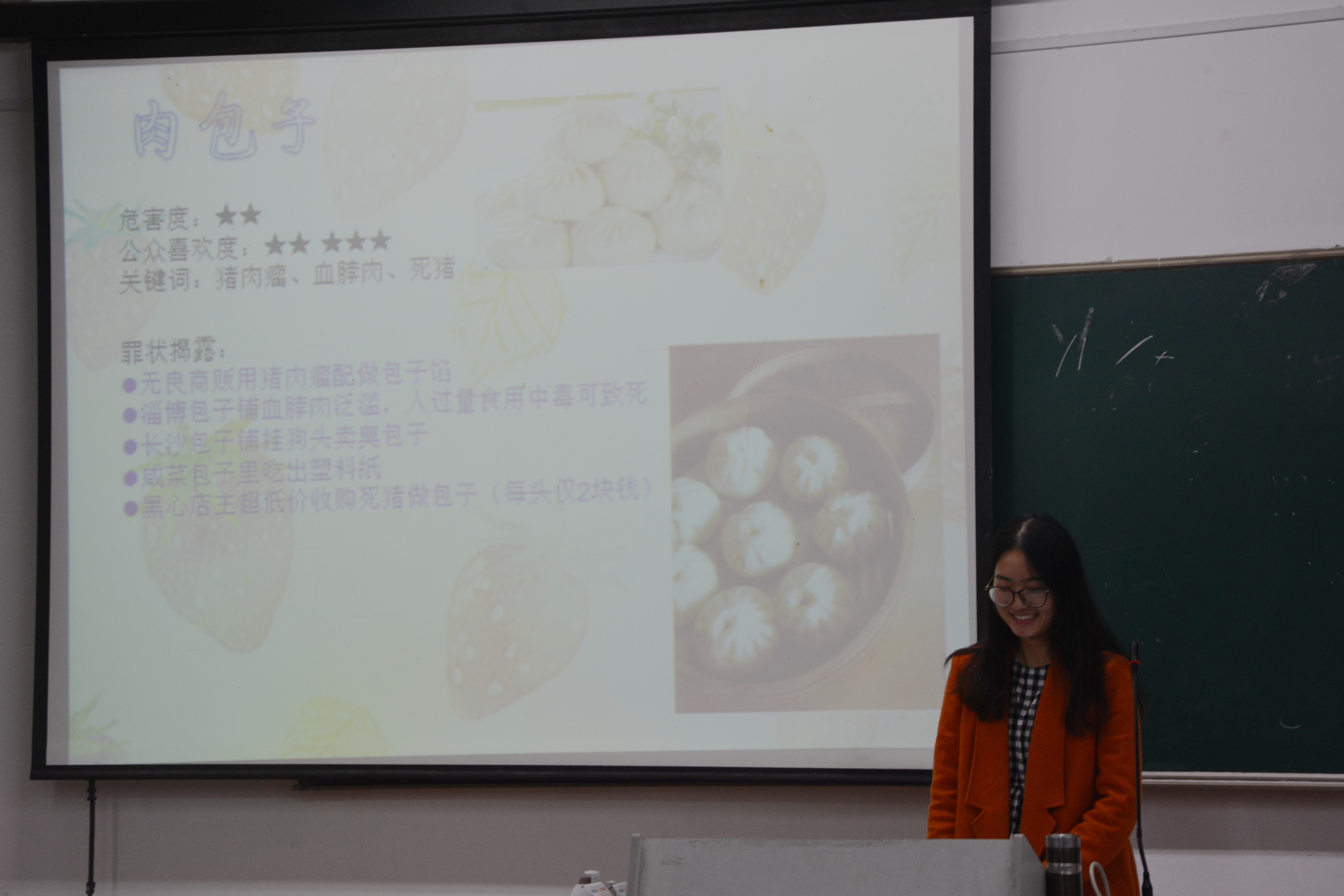 决赛分为选手自述和评委点评两个环节,评委综合选手的表现进行打分,每支队伍派一名代表以ppt的形式向评委和同学们展示自己小组的研究成果。首先上场的是来自食安151班的“272”小组。主讲人李柃漫以“食品安全何去何从”为主题进行演讲。她由一首打油诗引出主题,说明当今社会食品安全问题源于“无奸不商,无商不奸”。此外,她还列举了已经发生的食品安全问题,如三鹿奶粉中三聚氰胺过量事件,地沟油和皮革奶事件等。她们由此说明问题食品相当于慢性毒药,会对身体造成巨大的安全隐患。该小组又分别从企业、政府、消费者的角度说明了食品安全问题存在的原因,由此她们也提出了解决措施,提醒消费者们做到卫生饮食并提高警惕。接着上场的是生科141的“小公举”小组,她们以“我们身边的食品安全”为话题揭示了路边摊的黑幕。譬如烤肉串中的“挂羊头卖猫肉”,麻辣烫中使用福尔马林等。她们最后展示了饮食安全的十条黄金定律,强调要重视个人卫生和食品的清洗加工。最后参赛者是来自生科132的“舌尖之吻”小组,她们围绕食品添加剂介绍了添加剂分为着色剂、酶制剂、增味剂、防腐剂共四类。她们还介绍了食品添加剂的前景,相信新型无害添加剂的使用指日可待。最终,食品安全大赛的决赛圆满结束,生科132的“舌尖之吻”小组获得了第一名,食安151的“272”小组获得了第二名。生科132的“舌尖之吻”小组将代表色花堂 在本月29日中国计量学院参加校际决赛。