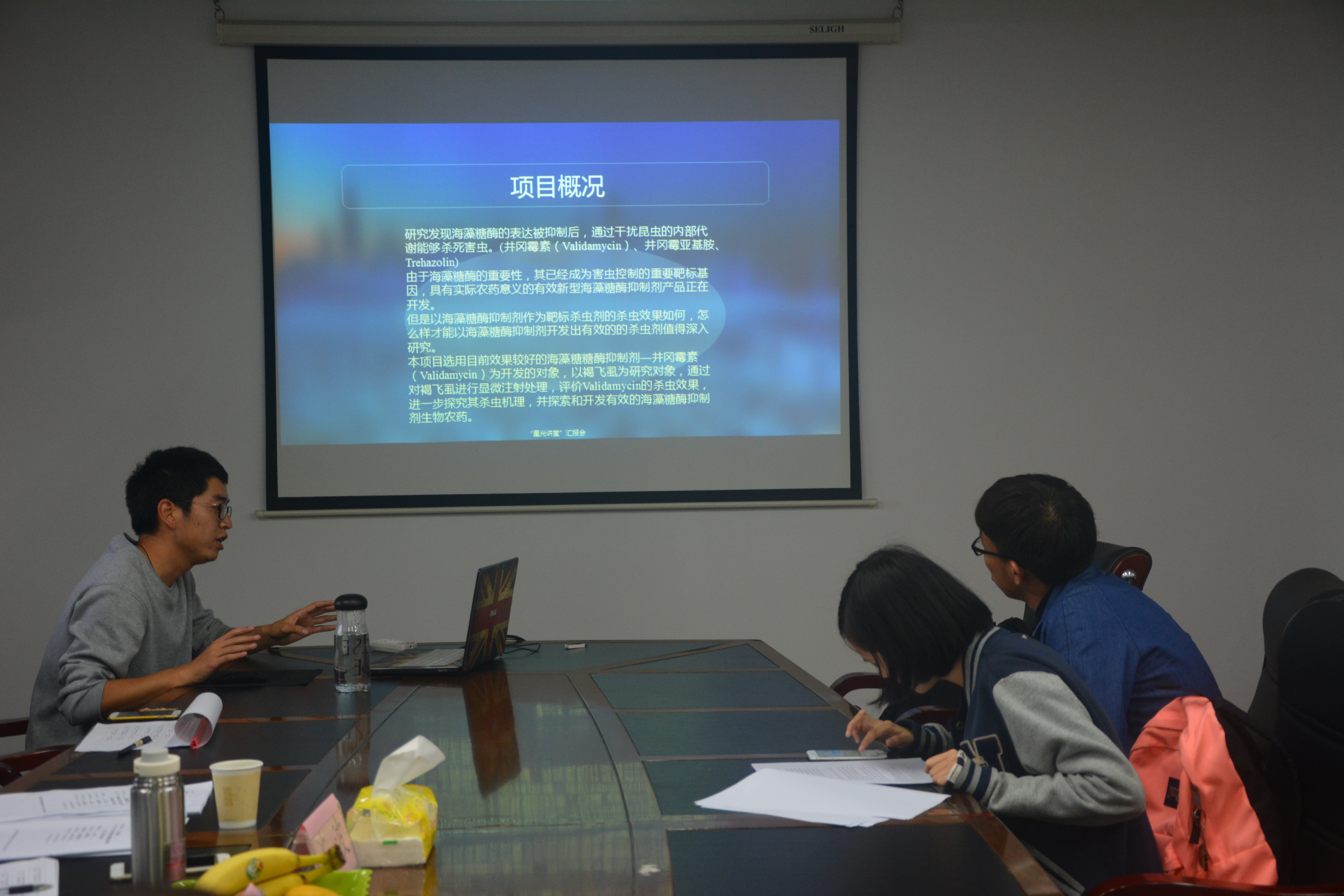 由负责人刘雅带来的“异色瓢虫低温储存下生理生化指标及抗寒基因表达变化”课题,将众学子带入了昆虫生活的世界,她用大量的数据严谨地证明了异色瓢虫为了抵御寒冷而大量积累海藻糖,在低温胁迫和储存下,存在6个关键的抗寒基因。负责人沈旭丹论述的关于“含天然植物防腐成分的新型化妆品产品的开发”等课题,积极引导了同学们向创新领域继续前进,为人类今后的健康发展贡献自己的力量。还有在课题“海藻糖酶抑制剂杀虫效果评价及应用”中,研究人员生动严谨地阐述了他们在本次课题研究中的启发及结论。他们发现了海藻糖酶的表达被抑制后,能通过干扰昆虫的内部代谢,杀死害虫。此项目选用了目前效果较好的海藻糖糖酶抑制剂——井冈霉素为开发的对象,以褐飞虱为研究对象,通过对褐飞虱进行显微注射处理,评价井冈霉素的杀虫效果,进一步探究其杀虫机理,并探索和开发有效的海藻糖酶抑制剂生物农药。在研究学员对此课题进行不断探索之后,他们得出了海藻糖酶抑制剂的有效浓度为0.1-10ug/ul五个浓度,井冈霉素能够有效抑制它的活性,从而调控几丁质合成酶、几丁质酶在mRNA在水平上的表达的结论。各个课题的负责人都答辩地自信昂扬,严谨缜密。最后,此次报告会共评出了11个优秀项目,其中郑伟同学的“益生菌肠球菌KQ2.6使用风险性评估”项目最优,将被学院推选为优秀团队。