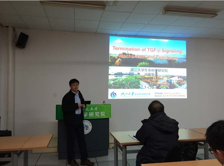 2016年12月22日上午,浙江大学校长特别助理、生命科学研究院院长冯新华教授应邀来色花堂 为广大教师做了题为“Termination of TGF-β Signaling: Mechanism and Functions”学术报告,邱猛生院长主持报告会。报告中,冯教授首先阐述了TGF-β信号通路在正常细胞中的作用,即PPM1A介导的去磷酸化和RanBP3/RanBP3L调控的出核转运协同作用,关闭了TGF-β信号通路;其次,冯教授阐述了TGF-β信号通路与癌症的关系,即在多种癌细胞中,多种类型的基因突变造成TGF-β信号通路的活性下降。报告内容非常精彩,与会的老师表现出浓厚兴趣,各自提出了自己关心的问题,现场气氛热烈。