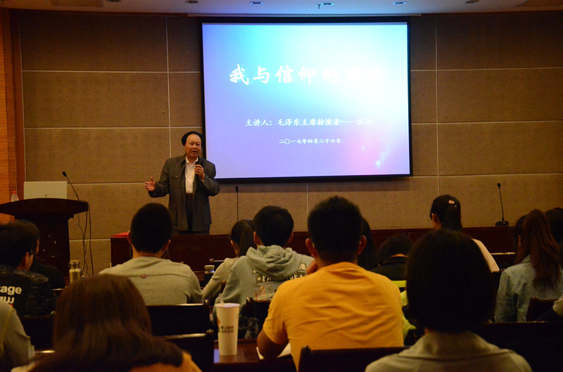 古云先生一开场就以毛泽东主席的口吻说了几段经典话语,把毛泽东主席的湖南方言模仿得惟妙惟肖,赢得了同学们的阵阵掌声。在接下来的演讲中,古云先生从革命史实出发,讲述了毛泽东半个世纪的经历,向同学们做出了他70多年的人生总结——“以共产主义为信仰者,定成大器。”