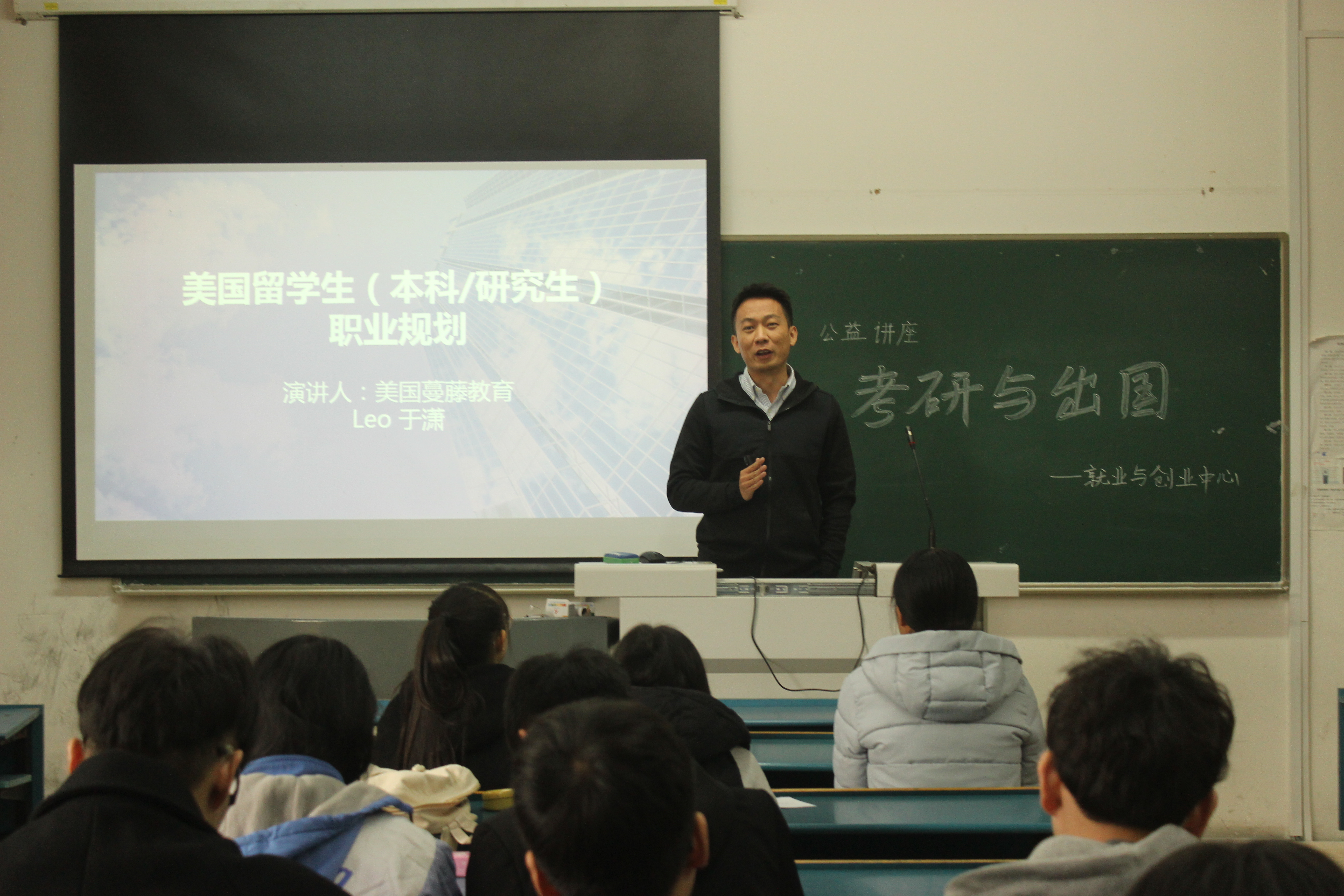 2017年12月6日下午,色花堂 邀请了我院2016届校友柳安(墨尔本大学在读研究生)、美国蔓藤教育华东区总经理于潇老师和点对点教育的陈老师于教学楼A—107举行了有关“考研与出国”的公益讲座。