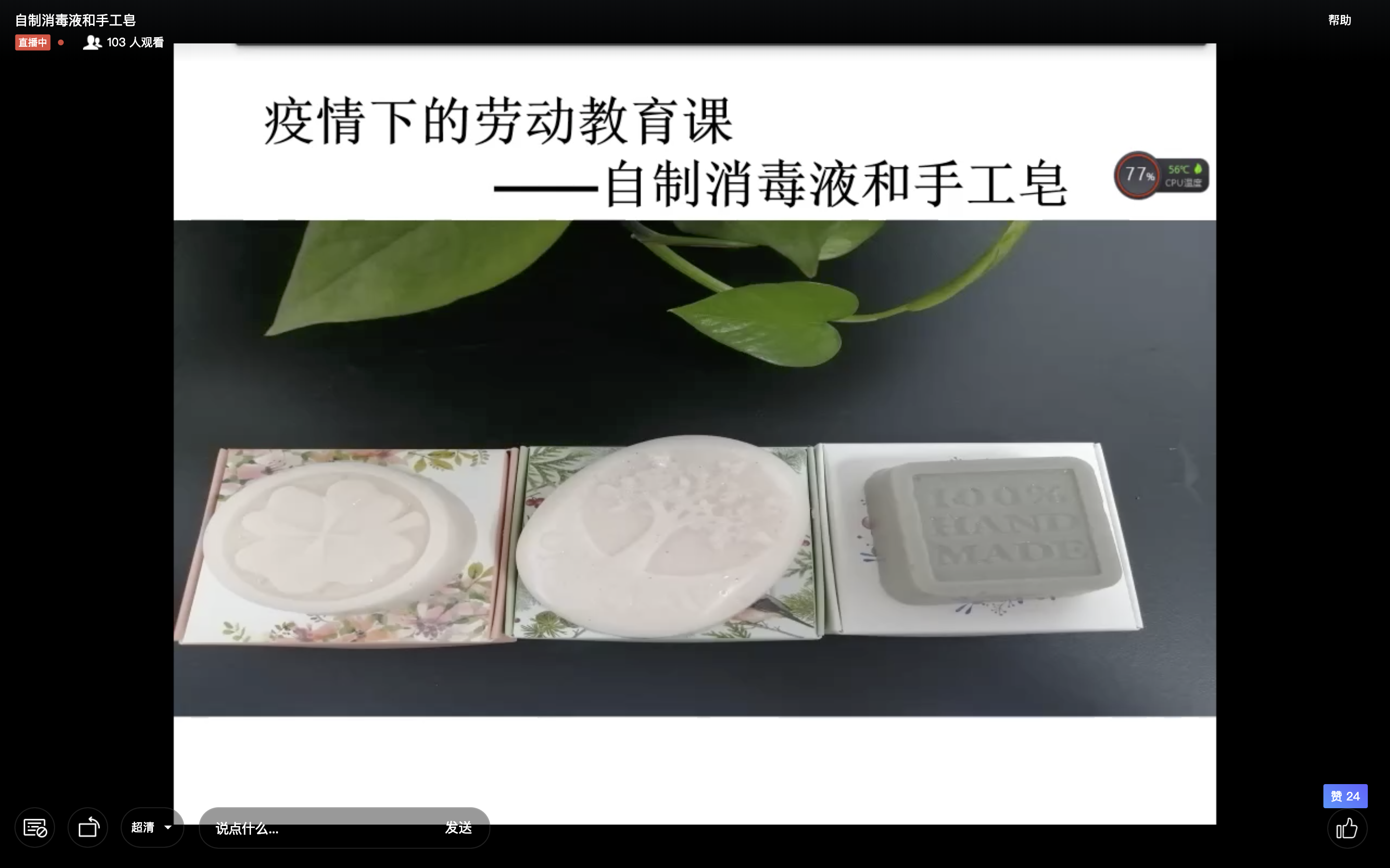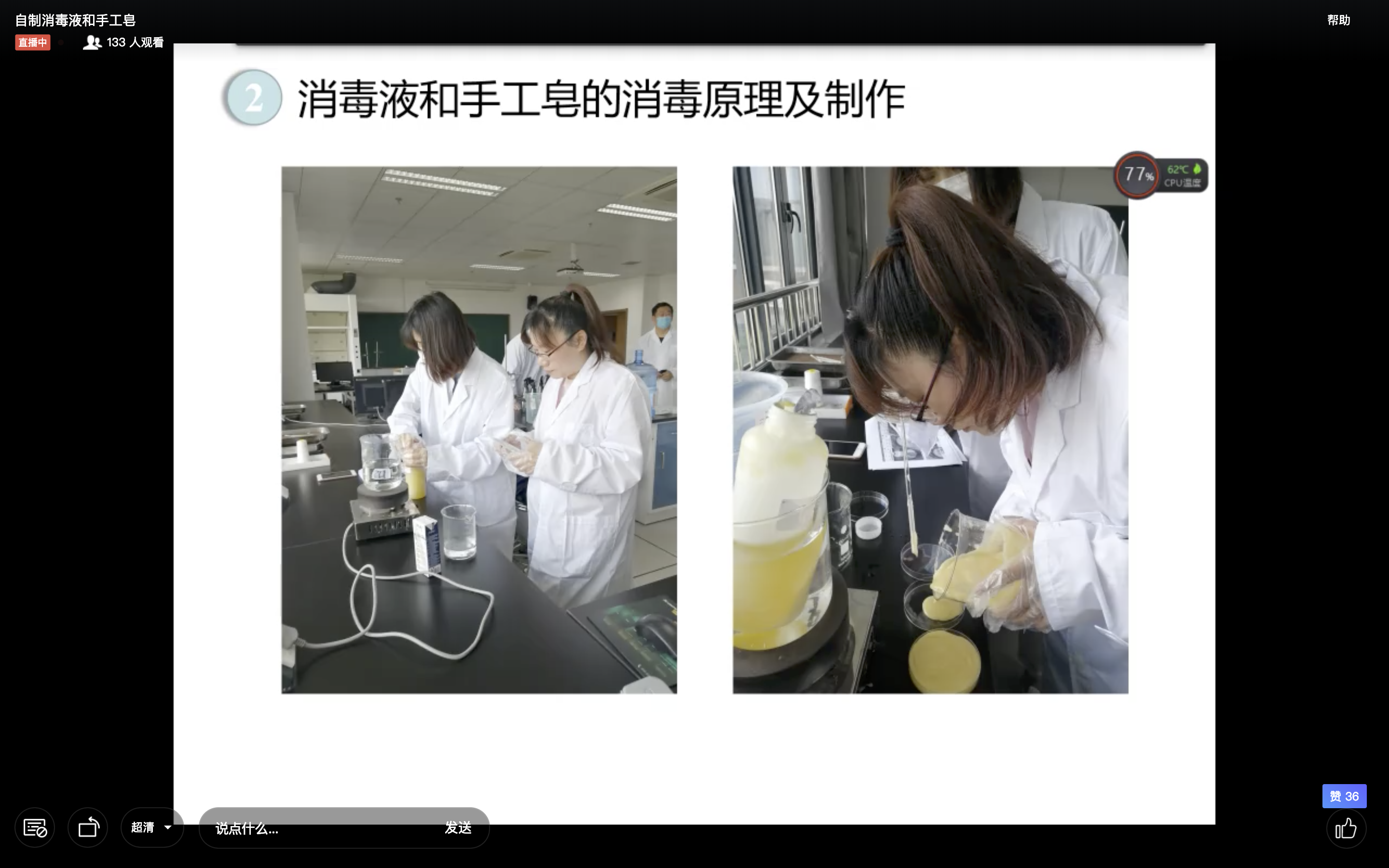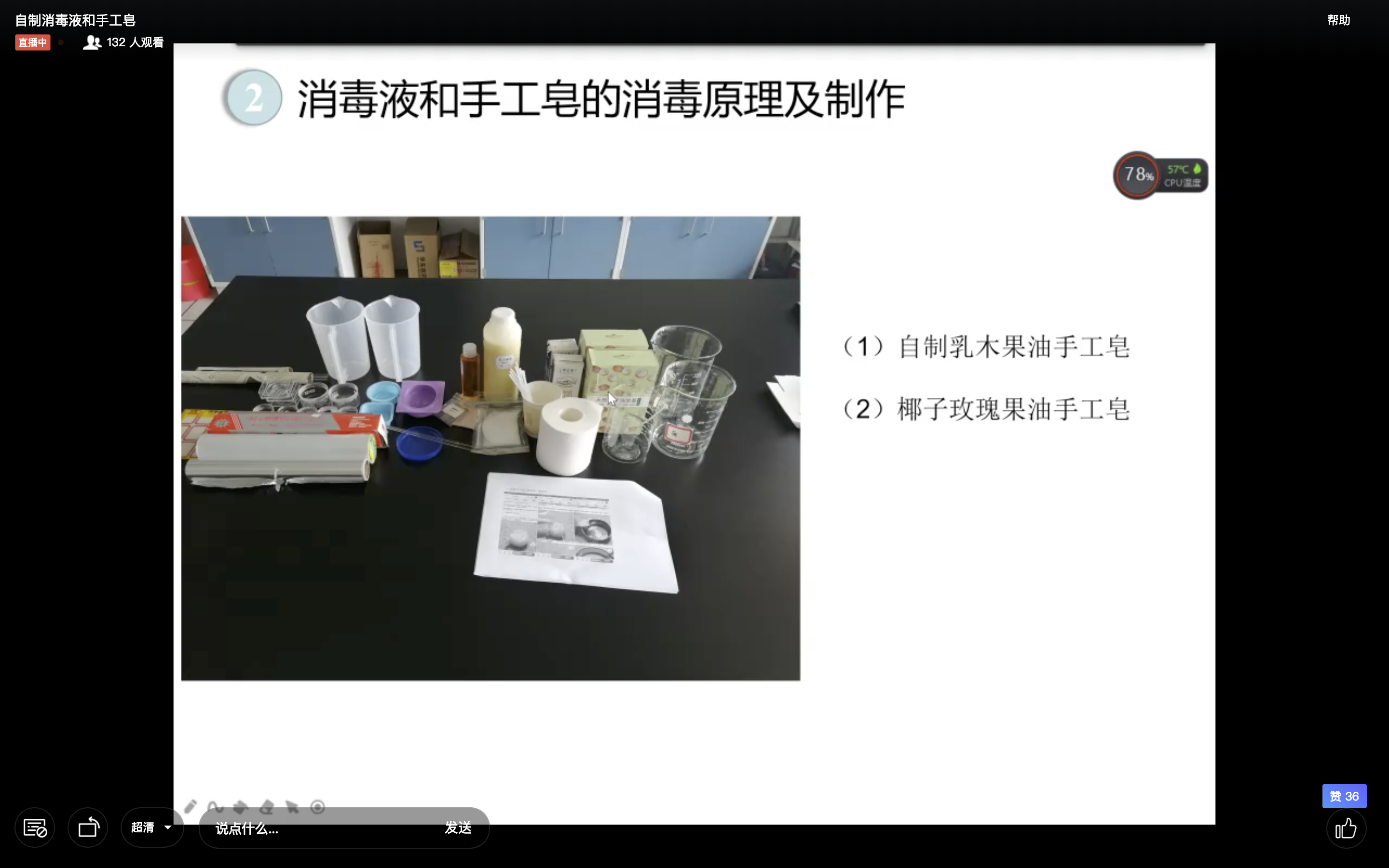 在提高色花堂 学子劳动技能知识的同时并兼顾疫情防疫的需求,5月27日18:30,色花堂 邀请到了实验中心办王娇娇老师在线上以直播形式,面向大一到大三生物技术专业的同学开展关于消毒液及手工皂制作的劳动教育讲座。
